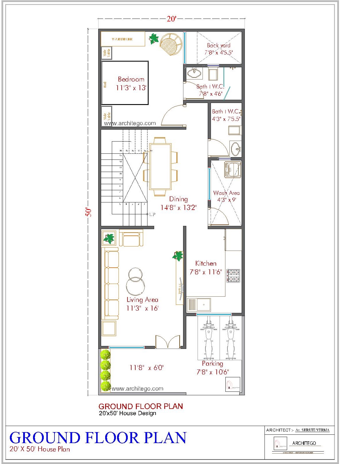 Hello, welcome to architego.com. This 20ft x 50ft (1000 sq. ft. ) house plan is one of our most popular layouts, offering balanced space planning with parking, garden, well-placed rooms, and easy circulation.